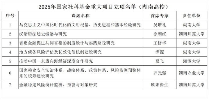 7个项目分别为:湖南大学吴增礼《马克思主义中国化时代化的文明根基、历史进程和基本经验研究》,王修华《普惠金融促进共同富裕的制度设计与实践路径研究》,洪源的《地方债务风险评估及长效化债机制建设研究》;湖南师范大学徐朝红《汉语语法通史编纂与研究》,欧阳资生《金融稳定风险统计监测、预警与对策研究》;湘潭大学夏飞《推动中国—东盟向海经济深度合作研究》;湖南农业大学罗光强《国家粮食安全法治体系、战略体系、政策体系、风险监测预警体系的统筹建设研究》。